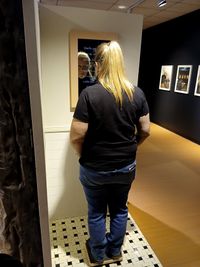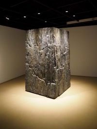 Pèse-personne, styromousse, bois, métal, fausses tuiles de céramiques, électronique, écran vidéo, miroir, texte.